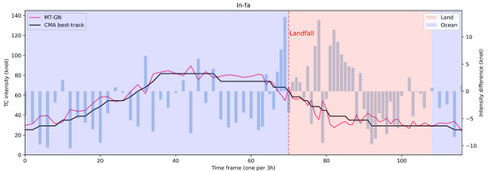 It can be seen from Figure 10 that in the initial development stage over the open ocean, there are both overestimation and underestimation. During the period when TC makes landfall on the coastline, the MT-GN underestimates the intensity, and the error value is rather large compared to other stages. This may be due to the rapid changes in the TC during this landfall period, making it difficult for the CNN feature extractor to interpret the MSI. After landfall, the MT-GN tends to underestimate intensity in the early stage and overestimate intensity in the later stage on land. In addition, we calculated the RMSE of TC In-fa over land and ocean, respectively. The RMSE of In-fa over land was 5.97 knots, and the RMSE over the ocean was 5.82 knots. This slight difference can be attributed to the influence of the topography of the land, which can affect the maximum sustained wind speed of the TC, leading to a slightly higher RMSE value compared to that of the oceanic regions. In the future, the inclusion of additional land surface information holds the potential to enhance model training.
