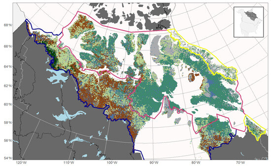 We focused on three ecozones in northern Canada [21] covering areas roughly north of the treeline—the Arctic Cordillera, Northern Arctic, and Southern Arctic ecozones (Figure 1). The study area stopped at approximately 74.5 degrees north (i.e., in the Arctic Ocean north of Banks, Victoria, Prince of Wales, Somerset, and the Baffin Islands). The vegetation present across the region is diverse and is generally north of the treeline, consisting of a combination of herbaceous plants, shrubs, mosses, and lichens (see [22] for a more complete breakdown of vegetation characteristic and communities present across the various subzones within the region). Across the study area, systematic fire monitoring has historically been of low priority. Although there are many small communities throughout, it is very sparsely populated. Land use mainly consists of low-impact traditional and cultural activities, with few permanent roads or energy corridors; however, various mines operate across the region.
