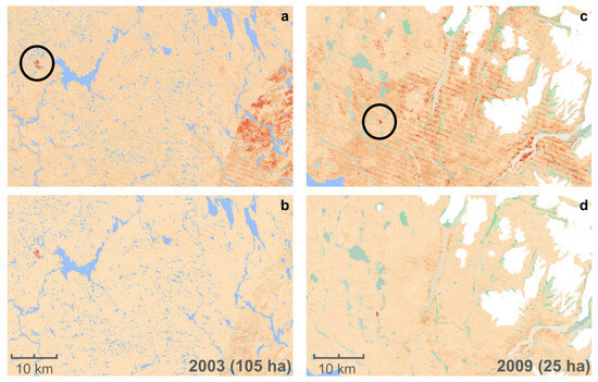 Between 2012 and 2022—the study period during which both the VIIRS and MODIS sensors were operating in the region—we found an unexpected pattern in hotspot detections for the fires in our dataset (Table 2). In particular, the MODIS sensors were more likely to detect a fire, despite having a coarser spatial resolution than the VIIRS sensors (1 km versus 375 m). This was a somewhat surprising finding, as others have shown that the VIIRS I-Band offers an improvement over the MODIS sensors in detection efficiency for small fires in other high-latitude and low-biomass regions [45,46]. We initially thought this difference might be related to overpass time and, possibly, early detection of short, wind-driven burn events (as the Terra platform passes over the equator at approximately 10:30 a.m. local time, followed by one of the VIIRS platforms at 12:40 p.m., then both the Aqua platform and the second VIIRS platform at approximately 1:30 p.m.). However, of the seven fires only seen by the MODIS sensors, the two smallest fires were detected only by the Aqua platform—the platform more temporally matched with the VIIRS sensors. Thus, it seems unlikely that overpass timing was the cause. Canada’s Arctic region is known to be extremely cloudy [47,48], and it is also possible that differences in cloud masking procedures between the two sensors resulted in altered detection efficiencies.