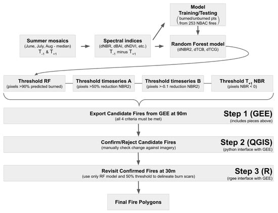 We used a three-step workflow to map fires (Figure 3). First, candidate fire detections—pixels that met a four-rule criteria (details below)—were exported from GEE. Next, candidate fires were visually inspected to confirm a change event was fire-related, as changes in hydrology, thaw slumps, mining activities, road expansions, phenological differences, etc. were frequently detected. Finally, we used R Statistical Computing Software, version 4.2.2 [28], to revisit confirmed fires and delineate a refined fire perimeter at 30-m resolution, utilizing the ‘rgee’ package [29]. This multi-stage approach was used to reduce the large search space down to a finite set of areas that had experienced change events and stay within the computation limits of GEE.