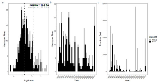 Distribution of (a) fire size in hectares, (b) number of fires per year, and (c) burned area per year within the study area from 1986 to 2022. The National Burned Area Composite (NBAC) data are in grey and the new fires detected in this study are in black, with the median fire size denoted by the vertical dashed lines (in (a)).
