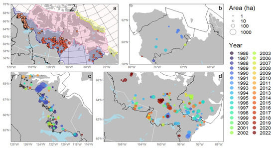 Spatial distribution of newly detected tundra fires that occurred between 1986 and 2022 (orange circles in (a), with individual fires north of 66°N shaded lighter orange. Fires previously mapped in the NBAC are black stars. Panels (b–d) are centered over each sub-region of fire clusters, showing the fire area as graduated point sizes and the year of burning as colors.