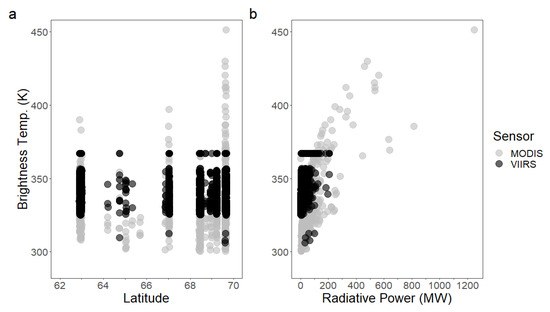 An alternative explanation may be due to the higher fire radiative power (FRP) detected by the MODIS sensors at northern latitudes [49]. While FRP is not part of the detection algorithm on its own, it is calculated directly from brightness values (in Kelvin) detected by each sensor [49]. Thus, the relatively lower FRP (which is derived from brightness) observed by the VIIRS sensor, suggests it is possible that the VIIRS fire detection algorithm may be unintentionally calibrated in a manner that misses fires in this region. Specifically, the VIIRS and MODIS fire-detection algorithms are similar at their core—both relying on the MODIS C6 algorithm—but the VIIRS algorithm separates fire pixels from background pixels using only the fixed thresholds test (see [50]), while the MODIS algorithm uses the same fixed thresholds test but also incorporates a newer dynamic threshold test [49,50,51]. Indeed, a post-hoc examination of the archived near-real-time Fire Information for Resource Management System (FIRMS) Global VIIRS and MODIS data [52] over fires observed by both sensors found generally higher brightness values for the MODIS sensors and a consistent saturation from the VIIRS sensors (Figure 6a). Moreover, given brightness is constrained onboard VIIRS, there is a resulting disconnect in the relationship between brightness and FRP (Figure 6b).