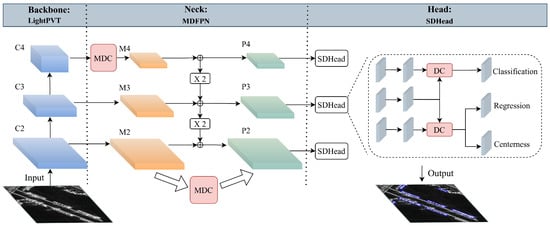 where and designate convolutional layers with kernel sizes of and , respectively. denotes the parameter passing process through the MDC module. represents nearest-neighbor interpolation, while represents max pooling. Finally, the output feature maps of the MDFPN neck network are {P2, P3, P4}.