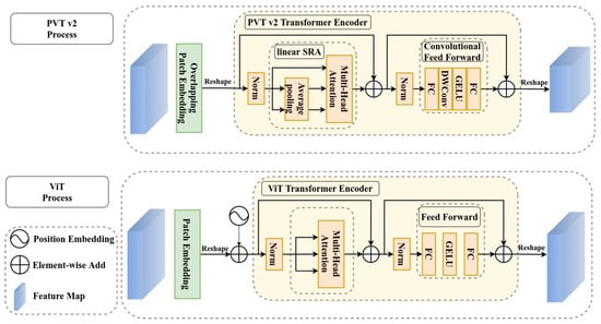 Pyramid vision transformer (PVT) [40] is the first fully transformer-based backbone network specifically designed for object detection tasks. Unlike previous designs, PVT adopts a hierarchical design based on ViT, utilizing multiple independent transformer encoders without convolution operations. To address the challenge of high computational complexity, PVT v2 [41] was proposed. PVT v2 introduces several modifications in comparison to ViT, as illustrated in Figure 2. Firstly, PVT v2 incorporates an overlapping patch embedding layer, utilizing convolution with zero padding to extract overlapped features for richer detailed information. Additionally, through parameter adjustments, PVT v2 reduces the length and width of feature maps while the length and width of the feature map remain unchanged in ViT. Secondly, PVT v2 implements a linear spatial reduction attention (SRA) layer by utilizing average pooling to decrease spatial dimensions and minimize computational costs. Lastly, PVT v2 employs a convolutional feed-forward layer, adding a 3 × 3 depth-wise convolution operation between the first fully connected (FC) layer and GELU, while also removing the position embedding.