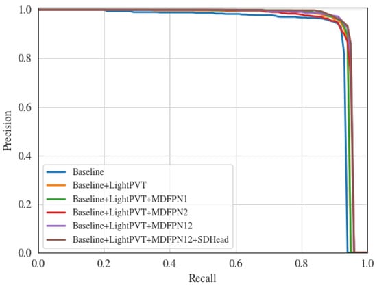 According to Table 3, each module we propose contributes to the overall method’s accuracy and speed compared with the baseline network. In terms of accuracy, the addition of the proposed modules leads to varying degrees of improvement in metrics such as AP, AP50, and AP75. Specifically, there are increases of 2.2%, 3.2%, and 3.2%, respectively, demonstrating the higher accuracy of the proposed modules. As for speed, the proposed method replaces the backbone network of the baseline network from ResNet50 with LightPVT and reduces the number of channels from 256 to 32. This results in a significant decrease in the FLOPs and Params values of the proposed method. Additionally, the gradual inclusion of MDFPN and SDHead does not lead to a significant increase in the FLOPs and Params values, indicating the lightweight character of these proposed modules. Figure 7 visually illustrates the gains of each module we propose by plotting precision–recall curves of the overall method with different modules added when the IoU is 0.5.