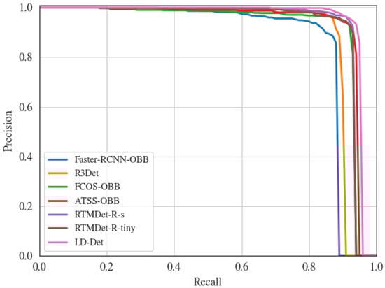 We conducted a quantitative analysis of various arbitrarily oriented detection methods using the SSDD dataset, and the specific detection results are presented in Table 4. The table indicates that our proposed method, LD-Det, achieved the highest values in terms of AP50, AP75, and AP, with respective scores of 94.6%, 60.5%, and 54.4%. For example, in terms of AP50, LD-Det outperformed RTMDet-R-tiny, RTMDet-R-s, and ATSS(OBB) by 2.5%, 2.1%, and 1.7%, respectively, demonstrating the superior accuracy of our proposed method. Additionally, LD-Det showcased considerably lower FLOPs and Params, 3.78 G and 2.50 M, respectively, compared with other methods. In particular, when compared with the popular lightweight method RTMDet-R-tiny, LD-Det achieved a nearly halved value for Params while maintaining similar FLOPs, thus illustrating fewer parameters in our proposed method. In summary, our proposed method achieves excellent performance by obtaining the highest accuracy in multiple metrics while keeping low spatial and temporal complexity. To visually highlight these differences, Figure 8 showcases the corresponding precision–recall curves for an IoU of 0.5, further demonstrating the advantages of LD-Det from a different viewpoint.