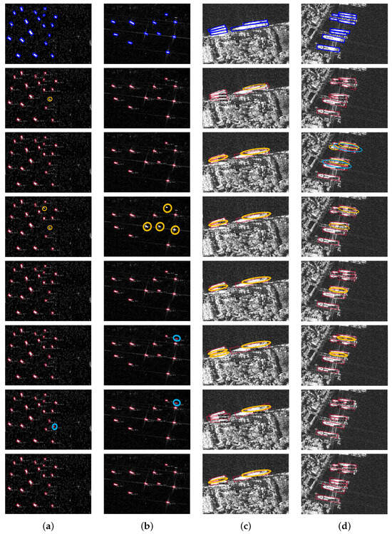 Some visual results on SSDD. From top to bottom, the methods are ground truth, Faster R-CNN(OBB), R3Det, FCOS(OBB), ATSS(OBB), RTMDet-R-s, RTMDet-R-tiny, LD-Det. (a) Simple View 1, (b) Simple View 2, (c) Complex View 1, (d) Complex View 2. In the figures, the blue rectangles represent annotations of the ground truth; the red rectangles represent annotations of TP; the light-blue ellipses represent annotations of FN; and the orange ellipses represent annotations of FP.