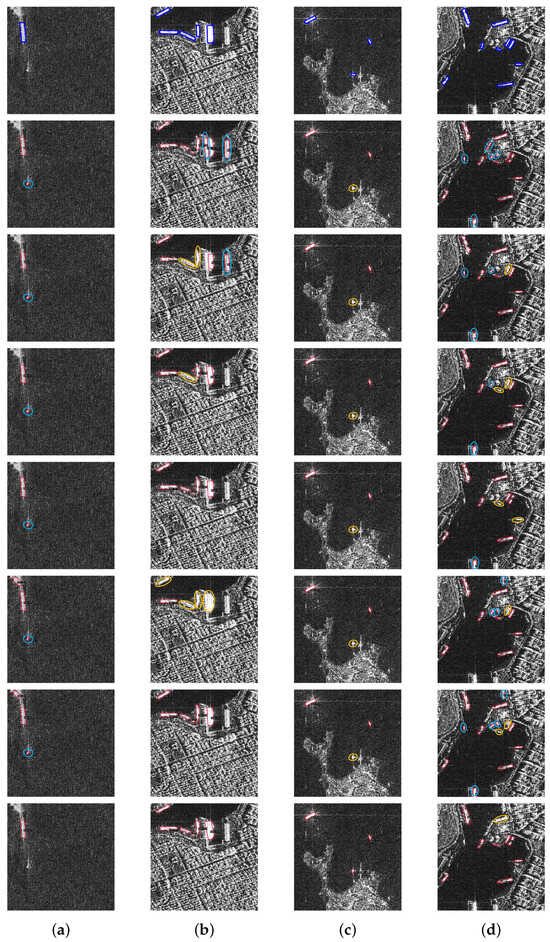 Some visual results on RSDD-SAR. From top to bottom, the methods are ground truth, Faster R-CNN(OBB), R3Det, FCOS(OBB), ATSS(OBB), RTMDet-R-s, RTMDet-R-tiny, LD-Det. (a) Simple View 1, (b) Complex View 1, (c) Complex View 2, (d) Complex View 3. In the figures, the blue rectangles represent annotations of the ground truth; the red rectangles represent annotations of TP; the light-blue ellipses represent annotations of FN; and the orange ellipses represent annotations of FP.