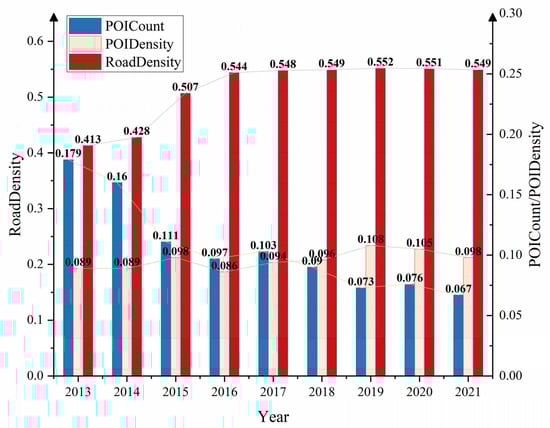 Figure 2 and Table 2 depict China’s global Moran’s Index for OSM data. Notably, the Moran’s Index of OSM data remains consistently positive from 2013 to 2021. Among the three variables, road network density displays the highest Moran’s Index, outperforming POI count and POI density.