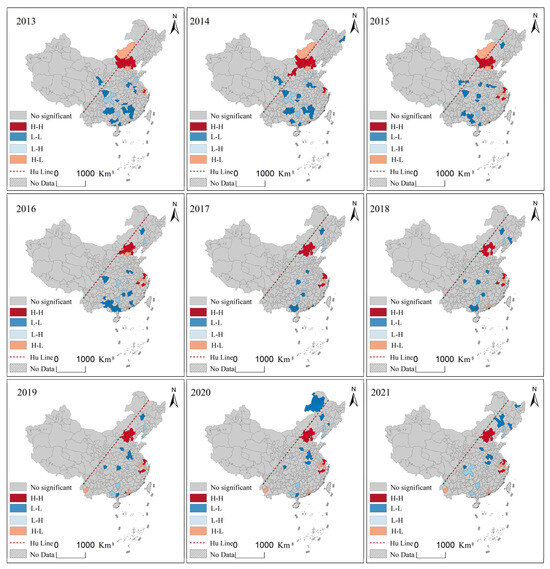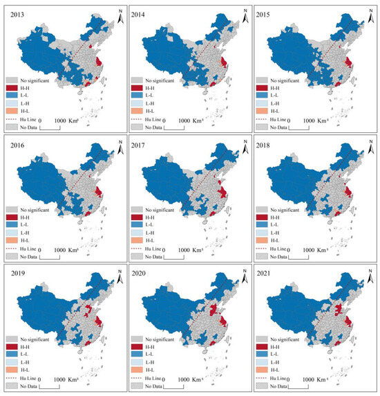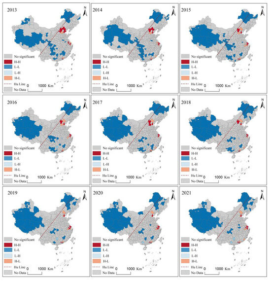 To delve into the local spatial characteristics of OSM data from 2013 to 2021, spatial autocorrelation analysis was performed. This analysis unveiled significant disparities between eastern and western regions, highlighted by the Hu Line [68], an east-west economic demarcation. Separating the region based on this line offers insights into economic differences and aids in explaining spatial autocorrelation.