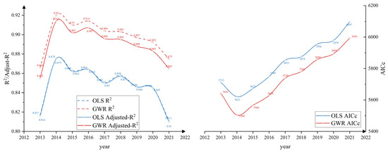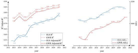 Figure 6 illustrates that the GWR results surpass OLS, with a noteworthy improvement of 0.214 in adjusted R2 and a substantial decrease of 3074.68 in AICc [67] (in model comparisons using AICc, a difference greater than 3 indicates the model with the lower AICc is the better fit [69,70,71]). Furthermore, the economic modeling with OSM data has shown consistent enhancement, with adjusted R2 rising from 0.717 in 2013 to 0.844 in 2021. Additionally, local R2 values are presented in Figure 7.