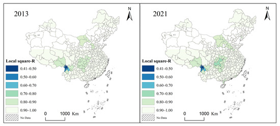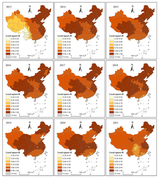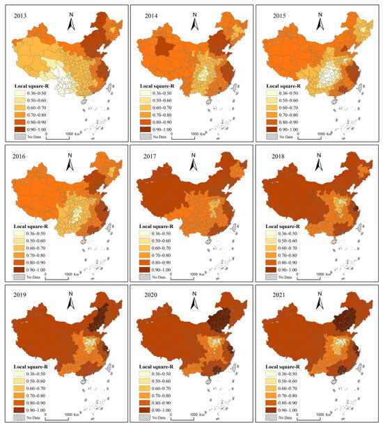 From Table 6, we observe that from 2013 to 2021, 90.04% of the 3021 analyzed prefecture-level cities had a local R2 exceeding 0.9, while 9.04% had local R2 values from 0.8 to 0.9. Only 0.93% had local R2 values less than 0.8. In 2021, Chongqing had a local R2 of 0.799, being the sole city with a value between 0.7 and 0.8. Cities with local R2 below 0.7 were all in Yunnan Province. Diqing Tibetan Autonomous Prefecture had the lowest local R2 of 0.412 in 2021, the lowest nationwide. From 2013 to 2020, its local R2 ranged from 0.474 to 0.659. Two other cities with relatively lower local R2 values were Nujiang Lisu Autonomous Prefecture (2021: local R2 0.543; 2013–2020: local R2 0.592) and Lijiang (2021: local R2 0.613; 2013–2020: local R2 0.659).