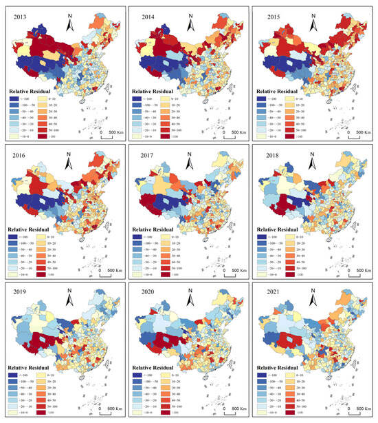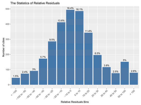 Figure 11 reveals that absolute residuals exhibit a normal distribution. Across all prefecture-level cities during this period, 46.2% have absolute residuals within the range of −200 billion to 200 billion yuan. Meanwhile, 7.5% exhibit extreme values exceeding 1000 billion yuan or falling below −1000 billion yuan. Notably, economically developed cities like Chongqing, Guangdong, Hubei, Hebei, and Zhejiang show substantial absolute residuals, while their relative residuals remain moderate (as depicted in Figure 13). Figure 13 indicates that relative residuals also follow a normal distribution. Among all prefecture-level cities, 32.5% have relative residuals within −10 to 10, 57.5% within −20 to 20, and only 4.1% with extreme relative residuals surpassing 100 or falling below −100. The latter are primarily concentrated in underdeveloped regions of western China, including Xinjiang, Qinghai, Tibet, Gansu, and Yunnan. However, their absolute residuals are not high.