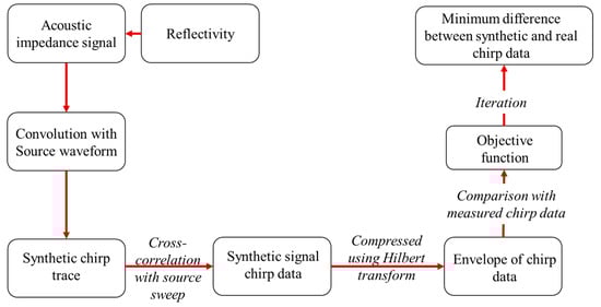 Seismic inversion is a process used to obtain a quantitative subsurface sediment profile from high resolution seismic data. It is solved by reducing the error between recorded and synthetic CHIRP sonar traces dependent on sediment properties and acoustic signal characteristics, through different optimization techniques [3,10,13,14]. The inversion approach can represent a pre-stack (full waveform inversion based on the P and S-wave velocity model and attenuation model) or a post-stack model (impedance inversion based on an impedance model). Post-stacking includes different geostatistical methods to estimate sediment properties including model-based inversion, colored inversion, band-limited impedance [12]. This paper applies a post-stack model-based inversion approach following the procedure suggested by [10]. The approach is summarized in Figure 2 and is based on minimizing the error between synthetic and recorded CHIRP amplitude envelopes. The synthetic data is obtained through convolution of the reflectivity calculated from the initial acoustic impedance step function (Equation (1)) with the source waveform which depends on the CHIRP source sweep (in this paper: 8–12 kHz sweep).