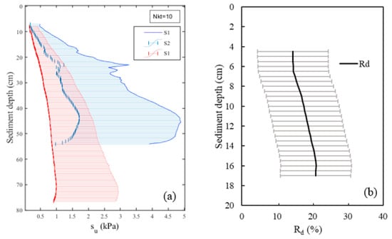 (a) Undrained shear strength profiles from PFFP measurements for S1 and S2 based on qsbc using logarithmic strain rate correction (k = 0.13) and (b) relative density (Rd) values estimated for S3 along the sediment depth using PFFP measurements (black solid line) with errors bars of ±10%.