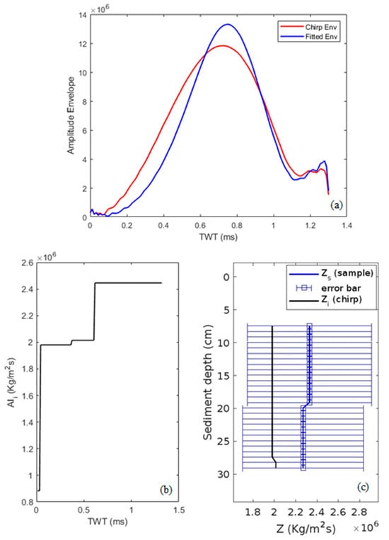 (a) Measured CHIRP sonar envelope (red) vs. fitted synthetic envelope (blue) for S1. (b) Final acoustic impedance model used to produce the fitted envelope as a function of two-way time and (c) deduced acoustic impedance from CHIRP Zi (black line) and acoustic impedance measured from sediment properties Zs (blue line with errors bars) with sediment depth.