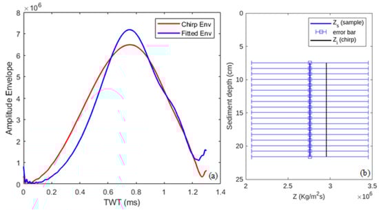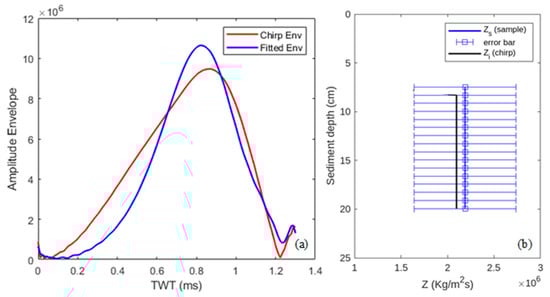 (a) CHIRP envelope vs. fitted envelope for S2 and (b) estimates of Zs (blue line) and Zi (black line) with sediment depth.