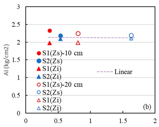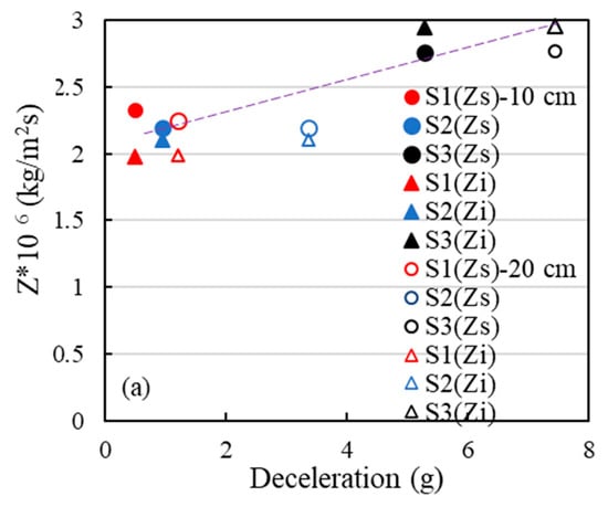 Acoustic impedance from sediment samples (circle shaped) and CHIRP measurement (triangle shaped) vs. (a) deceleration from PFFP and (b) su from PFFP at depths of 10 cm (filled) and 20 cm (unfilled) for S1 (red color), S2 (blue color) and S3 (black color). The purple dashed line is a trendline.