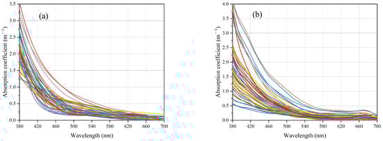 - By measuring the absorption coefficients of Lake Ebinur’s water body, the intrinsic optical characteristics of Lake Ebinur were investigated. Through this examination, it was observed that the absorption coefficients of SPM and CDOM approach zero at around 700 nm, where the dominance of pure water absorption coefficients in the total absorption of water becomes evident. In conjunction with the band configuration of Sentinel-2 remote sensing imagery, the wavelength of 833 nm was selected as the reference wavelength for Lake Ebinur.