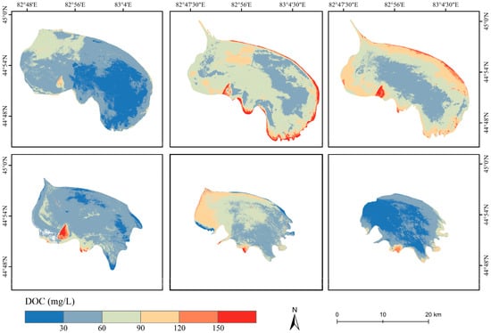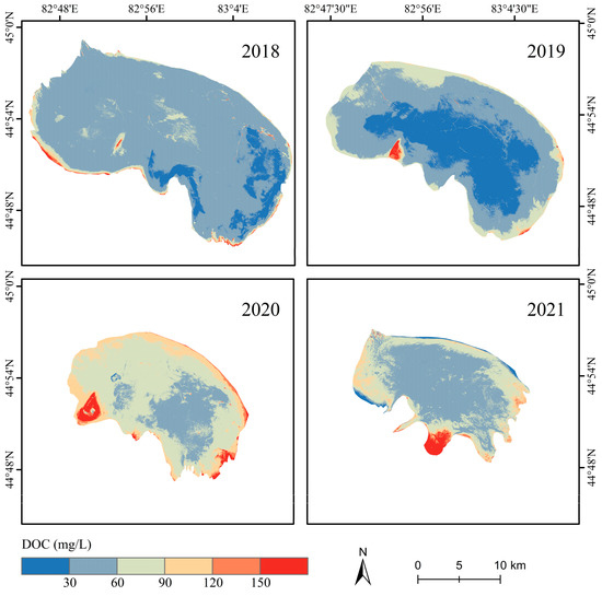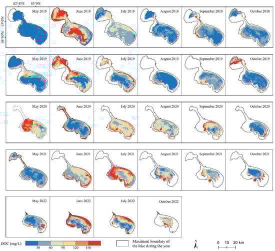 - By conducting a comparative analysis of the spatial variation in Lake Ebinur’s DOC, it could be inferred that from 2018 to 2022, Lake Ebinur’s DOC concentration exhibited an overall increasing trend. The concentration predominantly ranged between 30 and 90 mg/L, with a few regions displaying DOC concentrations exceeding 150 mg/L. Further comparison of Lake Ebinur’s spatial DOC variations from 2018 to 2021 revealed a year-on-year increase in DOC concentration. Additionally, upon contrasting the spatial distribution patterns of DOC across different months, it became evident that DOC concentrations in June and July of each year exceeded those in other months, while concentrations in May were notably lower.