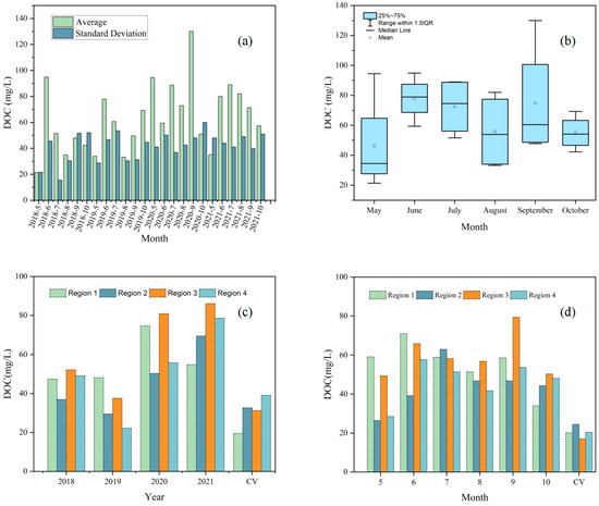 - Analyzing the temporal variations in Lake Ebinur’s DOC concentration revealed a distinct fluctuating trend, characterized by an overall increasing trajectory over time. Among these variations, the month of June stood out with the highest average DOC concentration (80 mg/L), whereas the lowest average concentration was observed in May (48 mg/L). From 2018 to 2021, the coefficient of variation in region 4 was the highest, and the coefficient of variation in region 1 was the smallest.