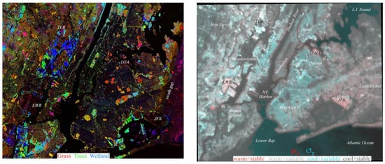 All of the thermal cycles seen in the temporal feature space are apparent in geographic maps of the low-order PCs. Figure 7 shows PC composites for the full (n = 124) low-rank component time series and the subset (n = 12) of nighttime (0–10 UTC) acquisitions. As expected, the land–water contrast is prominent on both composites, with water having very low values in PCs 1 and 2. On land, the strongest contrast is between the thermal cycles of open areas such as airports (red) and residential neighborhoods with high densities of deciduous tree canopy (green). In addition to airports and industrial areas, thermal cycle hotspots are also apparent in midtown Manhattan, the Financial District (southernmost Manhattan) and downtown Brooklyn, with their high concentration of tall buildings. The most prominent small thermal hotspot is located SW of Newark Airport (EWR), adjacent to the NW corner of Staten Island. This is an industrial area with multiple refineries and chemical plants. As would be expected, the Port of Elizabeth on the westernmost edge of NY Harbor also stands out as a thermal hotspot.