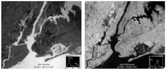Seasonal and diurnal thermal contrast. Early morning winter acquisition (left) shows water significantly warmer than land surface. Mid-afternoon spring acquisition (right) shows a bimodal distribution of opposite polarity with a very different spatial temperature distribution on the land surface. Both acquisitions span ~20° K. The spatial correlation is −0.77.