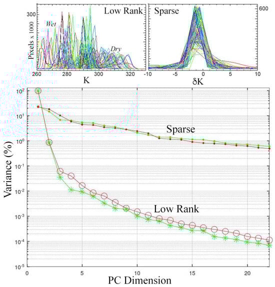 The spatiotemporal characterization of the L component time series uses a standard L2 principal component transformation to identify the dominant temporal patterns (annual and diurnal thermal cycles) and their spatial distributions corresponding to different land covers and water bodies. The variance partition of the orthogonal principal component (PC) dimensions, given by the eigenvalues of the covariance matrix of the time series, provides an indication of the spatiotemporal dimensionality of thermal cycles. This characterization of the spatiotemporal dimensionality and temporal basis functions is equivalent to the Empirical Orthogonal Function (EOF) analysis devised by [], except that the EOFs are temporal and the corresponding PCs are spatial—as required by the much greater number of spatial pixels than temporal acquisition dates. This characterization process is described in detail by []. The end result of this characterization is a parsimonious representation of the low-rank component of the LST image time series in the form of spatial principal components. These PCs illustrate the dominant thermal cycles on land and water in both geographic space and in a temporal feature space illustrating the diversity of thermal cycles observed. Because of the aforementioned aliasing of the diurnal cycle, these patterns represent primarily the annual cycles.