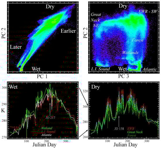 Low-rank component temporal feature space and temporal endmembers. Two low-order dimensions of the spatial principal components (top) illustrate the contrast between temperature range and seasonal cycle phase, while PC 3 shows NE–SW thermal gradient. Water bodies (lower left) have reduced seasonal and diurnal range, with annual peaks occurring around jd217, while land areas (lower right) have a greater temperature range, with earlier and more prolonged seasonal peaks. Vegetated areas, such as wetlands, forests and large cemeteries, span the thermal gradient between wet and dry due to evapotranspiration and thermal inertia of leaf water content. The NE–SW thermal gradient in PC 3 affects both land and water bodies. Note also much greater annual and diurnal temperature range of land compared to water.