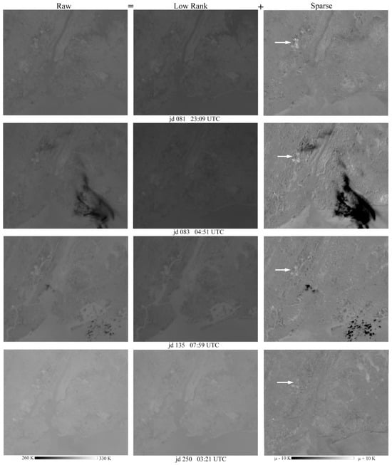 Figure 8, Figure 9, Figure 10, Figure 11 and Figure 12 provide illustrations of the RPCA separation of low-rank and sparse component time series for a variety of transient thermal anomalies, sensor artifacts, swath gaps and spatial misregistrations. In each case, the raw input images are shown along with their low-rank and sparse components side by side. A common 70 K temperature range (260° to 330°) is used for all raw and low-rank examples, with a smaller 20 K (−10° to 10°) range for the sparse residuals.