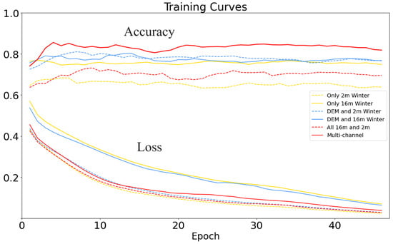 - Training results of two-channel models: The training results of Experiments 3 and 4 in Group 2 (Figure 3) were very close to each other and higher than the training results of Group 1, indicating that the DEM data could significantly improve the classification results, and the results of the two-channel models were better than the results of the single-channel models.