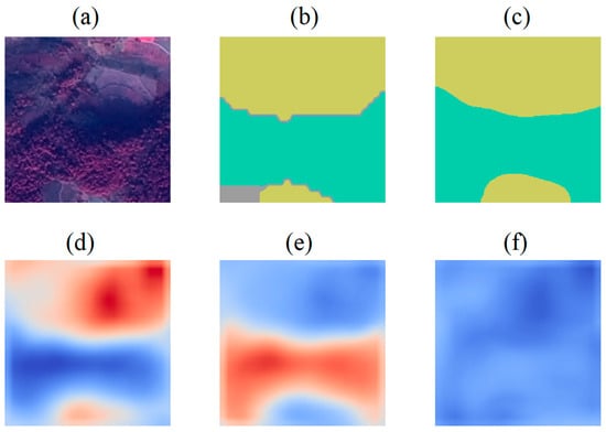 Classification results and their heat maps (cultivated vegetation and coniferous forest). (a) The remote sensing image with 2 m resolution; (b) the ground truth label of the vegetation map; (c) the classification results of the multi-channel model, where the yellow color represents cultivated vegetation, green represents broadleaved forest and blue represents coniferous forest in this experiment; (d–f) are the heat maps of cultivated vegetation, broadleaf forest and coniferous forest, respectively, where the red color represents high probability and blue represents low probability.