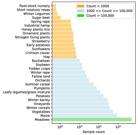 These aggregated (major) groups can be found throughout the European Union. The distribution of samples for each reclassified crop group can be seen in Figure 2 for the year 2021. All years, on average, contain 592,000 referenced agricultural parcels (Table A1), with similar class distribution. Most reference samples fall into a few prominent groups, namely maize, followed by vegetables, winter cereals, vineyards, and winter barley. Fourteen smaller classes represent categories with less than 1000 samples (orange), while meadows (green) have 92 times more samples than all smaller classes combined. It is worth noting that this distribution is specific to Slovenia and differs from that of other countries.