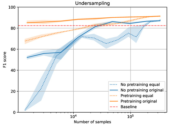 Figure 7 visualizes a pre-trained model (orange) performance with equal distribution next to the original distribution, measured by the F1 score. The pre-trained models always perform better than the corresponding models trained from scratch (blue). The two solid lines differ by 33% when 1500 samples are used. However, when the sample size increases to 48,000 samples, the difference decreases to less than 5%. Similar to before, the model was trained with an increasing amount of samples from a target year. In the case of pre-training (solid orange), the baseline can be outperformed with only 1500 samples (less than 0.3% of the original dataset). When we increased the size to 12,000 samples, the standard deviation of the solid orange line dropped below 1%, leading to consistent results between runs.