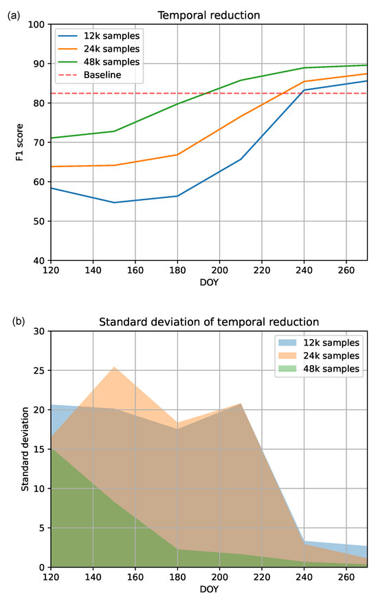 Model performance when increasing the available temporal information until each DOY. (a) The F1 score increases with both the number of samples and available temporal information. (b) The standard deviation of the F1 score decreases with the additional samples and information that becomes available as the year progresses and more observations are available to produce the classifications.