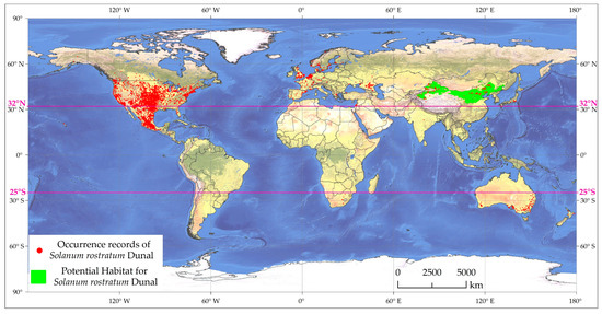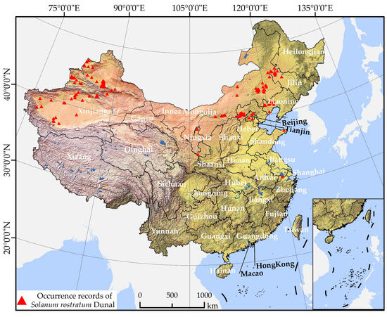 S. rostratum is an annual herbaceous prickly plant in the Solanum genus of the Solanum family and is an invasive alien noxious weed [45]. Typically, its plant height ranges from 30 to 70 cm, and the entire plant is covered with conical, spiny structures, carrying toxic properties. The flowers are yellow, and upon fruit maturation, they automatically split open, causing the seeds to be expelled and scattered in the vicinity. Each fruit contains between 55 and 90 seeds, and a single plant can yield an astounding number of seeds, often exceeding 10,000 [46]. This plant exhibits an astonishing reproductive capacity, characterized by dormant seeds capable of long-distance dispersal. Originally native to North America, it is a highly prolific, invasive, and harmful weed species. It first invaded Liaoning Province in China during the 1980s [47] and has since spread to numerous provinces and municipalities, including Inner Mongolia [48], Xinjiang [29,49], Shanxi [50], Jilin [51], Hebei [52], Tianjin [53], and Beijing [54,55]. S. rostratum typically inhabits environments like riverbanks, roadsides, grasslands, and agricultural fields [46]. Its secretions often exhibit inhibitory effects on the growth of native plants. This species boasts a high reproductive capacity and rapid growth characteristics, displaying predatory behavior as it competes for the essential nutrients required by crops, thereby adversely affecting crop growth. Moreover, S. rostratum serves as an ideal host for certain agricultural pests, such as the Colorado potato beetle (Leptinotarsa decemlineata Say), intensifying the risk of crop damage and resulting in noticeable yield losses. Additionally, the plants and fruit of S. rostratum are thorny and contain toxic substances, making them prone to adhering to livestock and diminishing the quality of their fur [56]. In the cases of livestock ingestion, S. rostratum can cause mild gastrointestinal issues or even lead to severe, fatal consequences. It also poses a certain level of harm to humans, primarily manifesting as skin redness or allergic reactions upon contact. Therefore, S. rostratum has caused significant harm to China’s ecological environment, agriculture, and livestock production, resulting in substantial economic losses [57]. On 1 January 2023, the “List of Key Management of Foreign Invasive Species” officially classified S. rostratum as a major invasive species in agriculture and forestry under Chinese management [56]. Currently, scholars’ focus on S. rostratum is primarily centered around the fields of invasion biology [58,59], reproductive strategies [60], metabolites [61], and control techniques [47,62]. With the continuous advancement of remote sensing technology, the use of unmanned aerial vehicle (UAV) remote sensing data for identifying S. rostratum communities and providing guidance for manual control has become a reality [52,63]. However, due to the relatively small stature of S. rostratum plants, their scattered distribution, and their tendency to coexist with other plant species, combined with the high cost of data collection, achieving large-scale, high-precision remote sensing monitoring remains challenging. While preliminary work has been initiated for predicting the potential distribution of S. rostratum based on species distribution models [51,64,65,66], several issues remain to be addressed. First, the environmental variables used in these studies tend to be relatively simplistic and do not fully account for diversity and complexity, potentially limiting the accuracy of model predictions. Furthermore, the existing methods for addressing collinearity between environmental variables often exhibit significant randomness and even subjectivity, leading to conflicting simulation results across different studies and raising doubts about the reliability of research findings. It is noteworthy that research concerning the future invasion trends of S. rostratum is relatively lacking, making it an area of urgent need of further investigation. Gaining deeper insights into its future spread and ecological impacts will facilitate a better understanding and management of this invasive species.