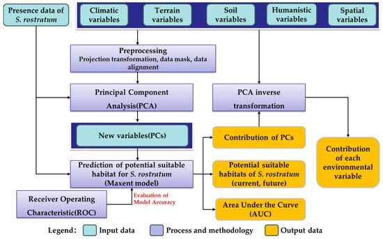 This study commenced by utilizing presence data for S. rostratum and integrating diverse remote sensing data sources, including meteorological, topographical, and soil data, to construct a multidimensional environmental variable dataset. Employing Principal Component Analysis (PCA) in conjunction with the Maxent model, we simulated the current and future potential distribution of S. rostratum in China. Subsequently, model accuracy was assessed through Receiver Operating Characteristic (ROC) curves. Finally, the contribution of each environmental variable to the species’ habitat distribution was evaluated using the contribution rates of Principal Components (PCs) derived from the PCA inverse transformation method combined with the output of the Maxent model. The specific process is illustrated in Figure 2.