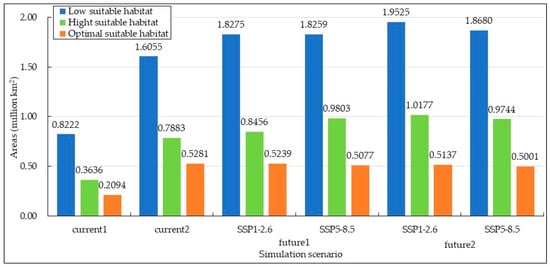 Areas of the potential habitat suitability of S. rostratum under various simulation scenarios in China.