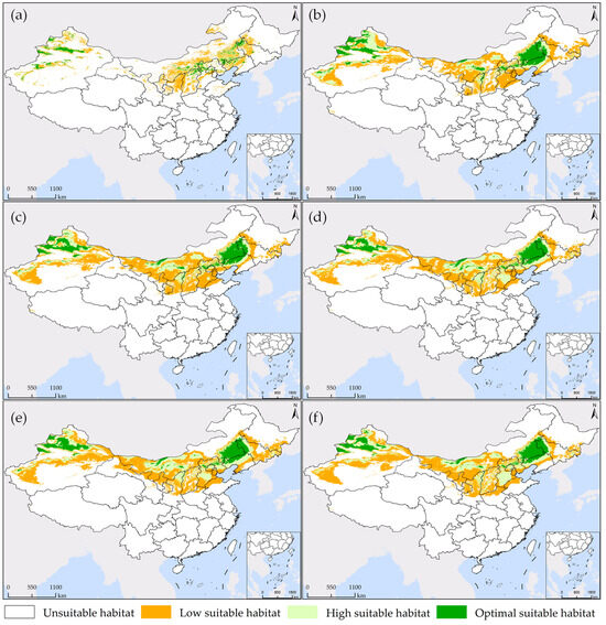 Map of the potential habitat suitability of S. rostratum under various simulation scenarios in China. (a,b) represent the prediction of current 1 and current 2, respectively; (c,d) depict projections for future 1 from 2021 to 2040 under SSP1-2.6 and SSP5-8.5 scenarios, respectively; (e,f) illustrate future 2 projections for the years 2041–2060 under the SSP1-2.6 and SSP5-8.5 scenarios, respectively.