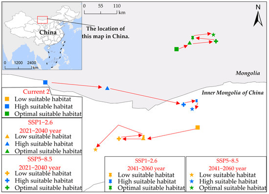 Alterations in the geometric center’s position within the potential habitat suitability of S. rostratum across multiple simulation scenarios in China. In this figure, various point shapes represent distinct scenarios, and point colors indicate different levels of habitat suitability. The red arrows highlight the directional shift in the geometric center of the S. rostratum habitat suitability.
