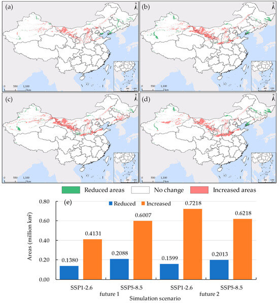 As shown in Figure 4 and Figure 5a, under the current 1 scenario, the optimal suitable habitat for S. rostratum constitutes 15.01% of the total suitable area. This habitat is most extensive and concentrated in Xinjiang, covering an area of 98,774 km2, which accounts for 47.17% of the national total. The suitable habitat is primarily located on the northern slopes of the Tianshan Mountains, in the Ili River Valley, and along the northwestern edge of the Tarim Basin. In comparison to other provinces, there is also relatively concentrated distribution in the border regions of three provinces: Shaanxi, Hebei, and Inner Mongolia, as well as the northwestern areas of Liaoning bordering Inner Mongolia and the northwestern regions of Jilin. The high suitable habitat constitutes 26.06% of the total suitable area, predominantly surrounding the optimal suitable habitat, with a relatively dispersed distribution. Inner Mongolia and Xinjiang encompass the largest areas of high suitable habitat, with 126,041 km2 and 112,057 km2, respectively. The low suitable habitat represents pioneer areas for species dispersion, and it exhibits the most extensive distribution, encompassing 58.93% of the total suitable area. It is primarily found in Xinjiang and in the border regions of provinces adjacent to Inner Mongolia, including Shaanxi, Shanxi, Hebei, Liaoning, Jilin, and Heilongjiang. In Inner Mongolia and Xinjiang, the total area covered by low suitable habitat reaches 452,141 km2, accounting for 54.87% of the total suitable habitat area nationwide.