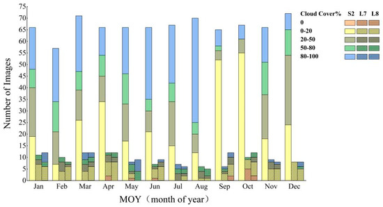 The number of remote sensing images available under different cloud content in the study area for 12 months in 2019. S2, L7, and L8 stand for Sentinel-2, Landsat 7, and Landsat 8.