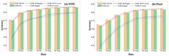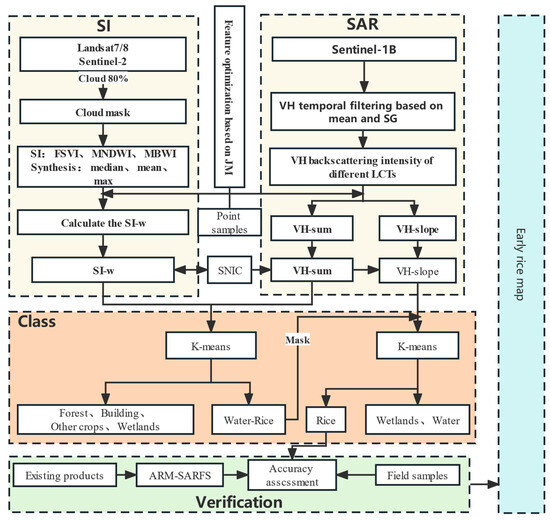 Meanwhile, the combination of SAR and optical images can improve the accuracy of rice mapping [25]. Instead of a single SAR data source, a combination of optical and SAR is usually applied to traditional machine learning algorithms for crop extraction [22]. Rice mapping based on machine learning of multi-source data often selects percentiles (5%, 25%, 50%, 75%, 95%) during the entire rice growth period or statistics (median, standard deviation, etc.) for each rice phenological stage or monthly synthetic data as features to train classification models [15]. Spectral indices have been widely used in this process. However, the mostly used SAR polarization characteristics are VH, VV, or VH+VV, especially the monthly median synthesized values or the polarization characteristics of the optimal phenological period selected by Jeffries–Matusita (JM) distance [26]. This cannot reflect the changing information of SAR backscattering intensity during the entire rice growth period. At present, there are few studies on the SAR index derived from the calculation of SAR polarization characteristics [27]. A new SAR index needs to be developed, that can reflect the dynamic characteristics of SAR backscattering intensity during the rice growth period [28]. In addition, the traditional pixel-based classification method has a “salt and pepper” phenomenon [29]. Previous studies have shown that the combination of Simple Non-Iterative Clustering (SNIC) based on high-resolution optical images and time-series SAR data can reduce the speckle noise of SAR data and remove speckles in classification results [30].