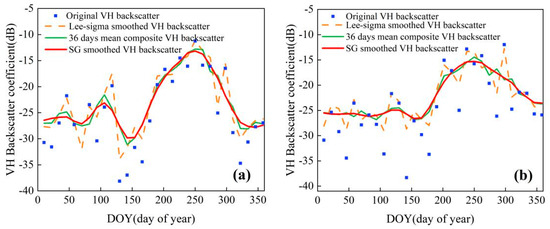 Reconstruction of the sentinel-1B SAR backscatter characteristics time series. (a,b) represent time series curves at different positions respectively.