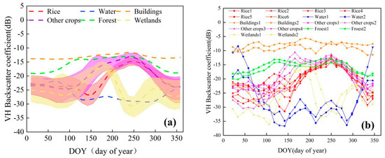 VH backscattering intensity of different land cover types in the study area in 2019. (a) The dashed lines represent the average, and the error bars represent the percentile 5% and 95%. (b) Typical VH backscatter intensity curves of different land cover types in the study area.