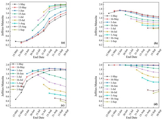 The JM distance was employed in this study to assess the discriminability of various land cover types based on VH-sum characteristics across different temporal intervals. As shown in Figure 5, different land cover types showed different characteristics in different phenological stages. Therefore, separability evaluation was performed on VH-sum features at different time intervals with different starting dates. Since the time resolution of Sentinel-1B is 12 d, the time interval was selected as half a month. The specific time interval design was shown in Table 6. The rice transplanting dates in the study area are mainly concentrated in mid-May, and then as the rice grows, the VH backscattering intensity of the rice gradually increases. This study used 15 May as the starting date and 1 month as the time interval to evaluate the separability of different land cover types in VH-slope characteristics in different time ranges.