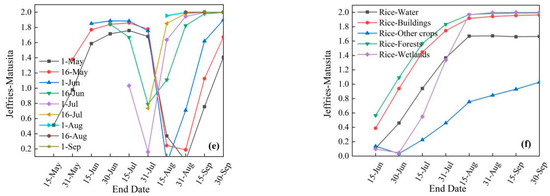 JM distance with different characteristics of different land cover types. (a–e) These indicates the JM of the VH-sum feature at different times. (a–e) These represent the JM distance of Rice-Water, Rice-Buildings, Rice-Other crops, Rice-Forests, and Rice-Wetlands. Image (f) shows the JM distance of the VH-slope feature in SART2. (a–e) For legends, refer to Table 6.