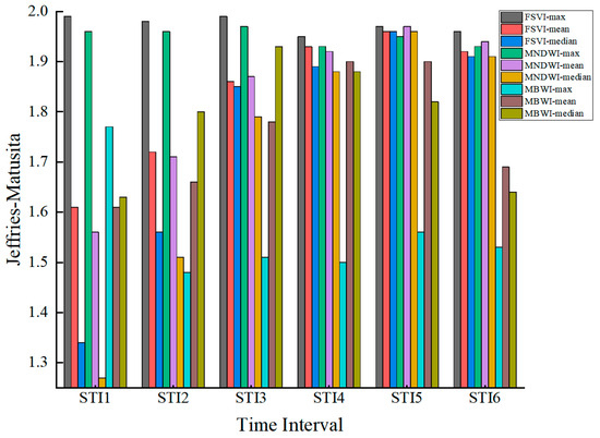 Analyze the JM distances of rice and other crops using different synthesis methods with different spectral indices in different periods (Figure 7). In the SIT5 stage, the spectral separability of the mean synthesis and median synthesis of FSVI and MNDWI is optimal. The median synthesis of MBWI (MBWI-median) obtained the highest JM distance of 1.93 in the SIT3 stage.