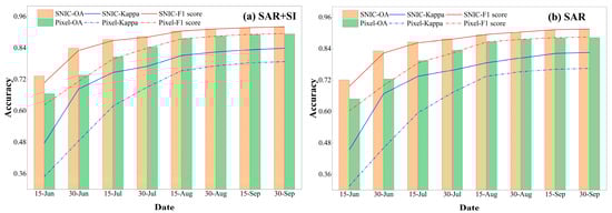 Through the JM distance analysis of the separability of various characteristics of different land cover types, the SART3 time stage was selected, with the starting date being 1 June 2019, and gradually extending until 30 September 2019, at half-month intervals. The PFO-HKMAR was employed to identify rice in different stages, and an accuracy evaluation was conducted. The determination of EIT was based on an examination of temporal changes and spatial distribution pertaining to rice mapping accuracy.